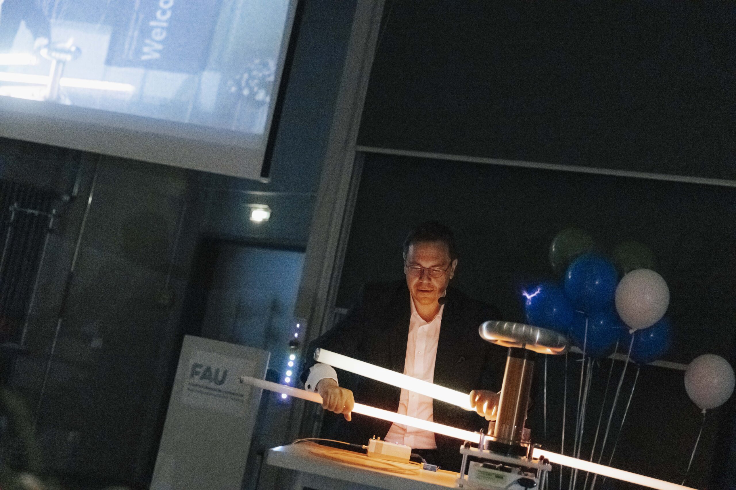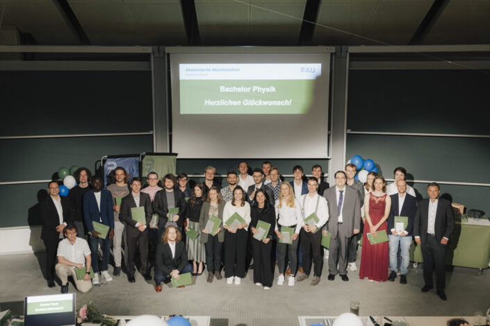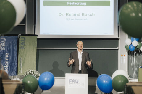 Als besonderen Gast begrüßte der Studiendekan Prof. Vojislav Krstic in diesem Jahr Dr. Roland Busch, CEO der Siemens AG. Er studierte selbst Physik an der FAU und kehrte an diesem Abend an seine Alma Mater und in den Hörsaal zurück. Die anwesenden Absolventen bekamen von Dr. Busch in einer unterhaltsamen Rede eine Vielzahl von Erinnerungen, Anekdoten und Überlegungen wie auch Empfehlungen für die Zukunft mit auf den Weg.